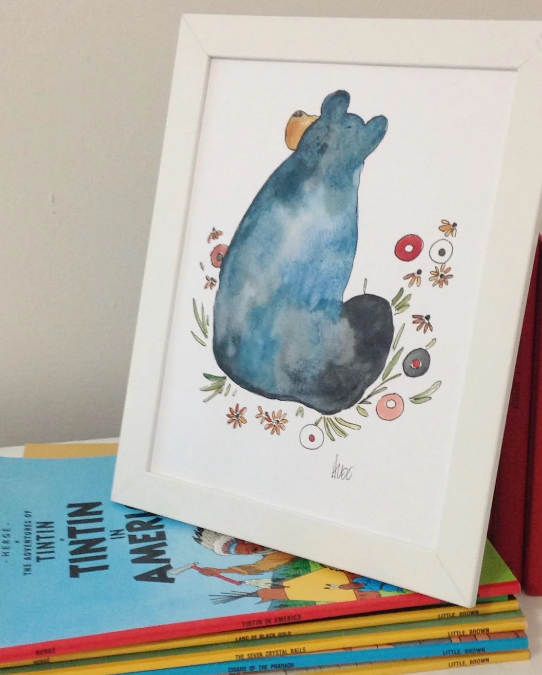 Signed digital reproduction of my original watercolor and ink illustration, Blue Bear in the Flower Patch.