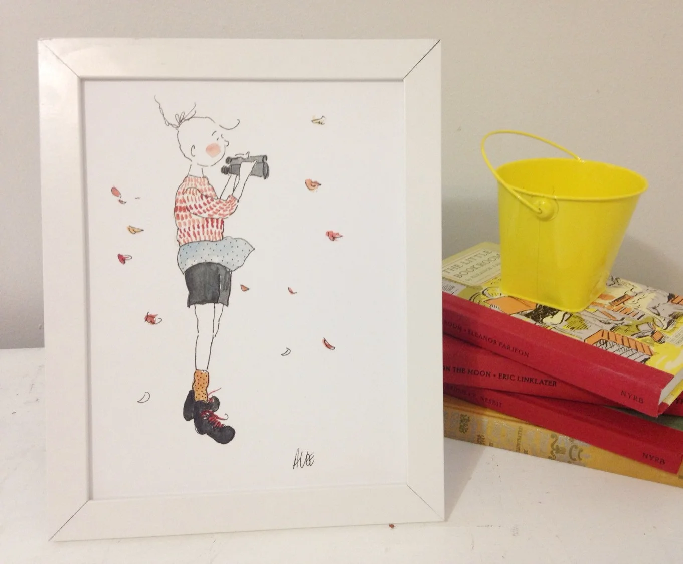 Signed digital print of original watercolor painting. Unframed 8.5x11" digital print, Girl & Binoculars. Mountain, Nature, Outdoors, Girl and Adventure Art